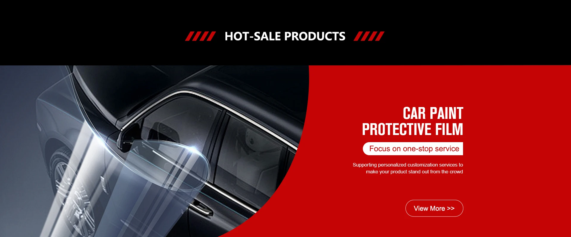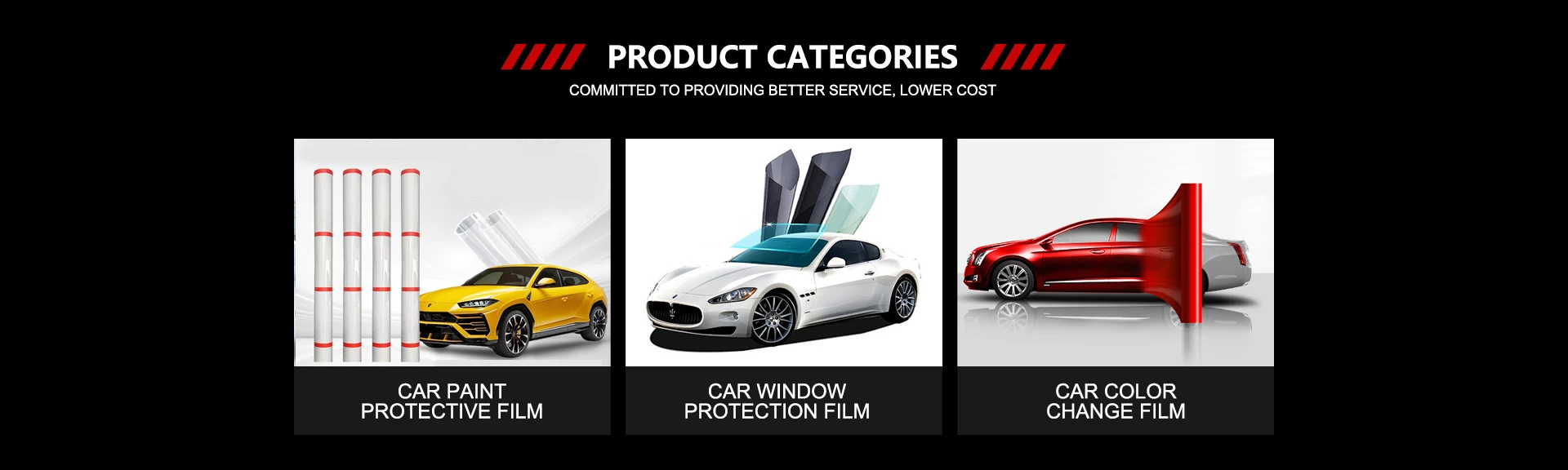 Productos principales:Envoltura de coche, película de protección de pintura, película de ventana, película de cambio de color de coche, herramienta de aplicación de película de ventana de coche